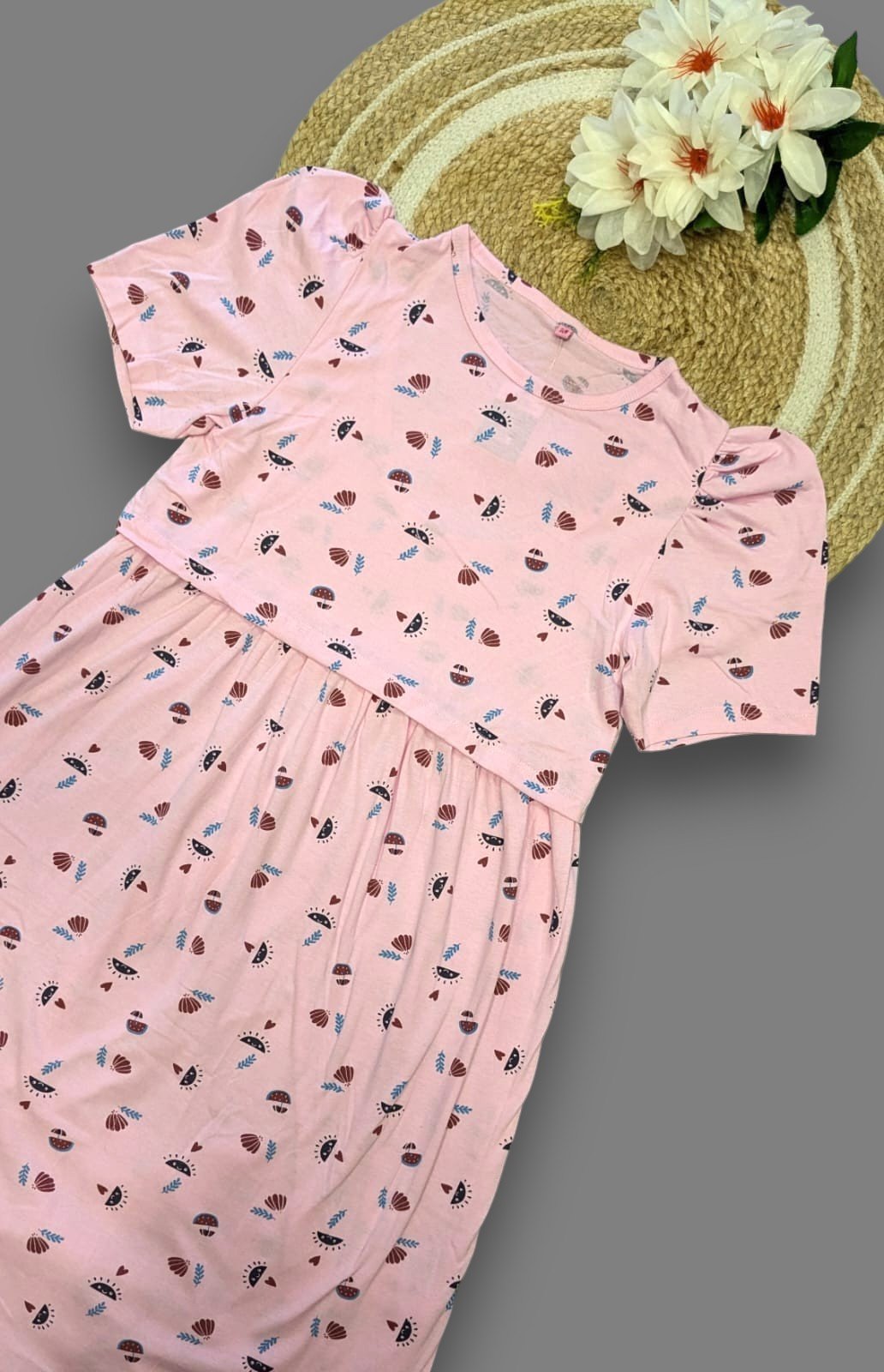 Premium Quality Pure Knitted Cotton Feeding Lounge Wear Zipless type - Baby Pink with Puff Sleeves